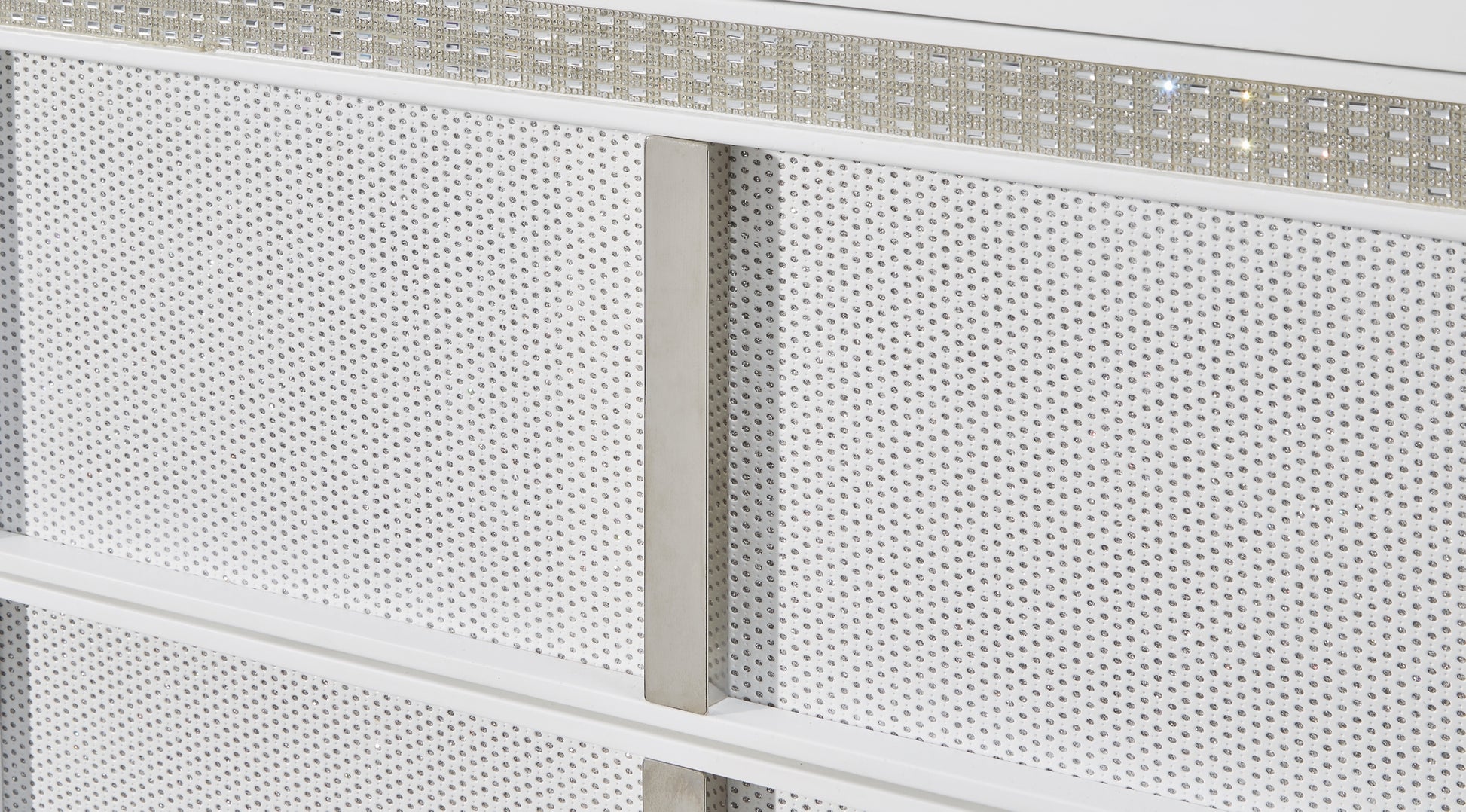 Details | Made with solid wood components, MDF substrate and decorative laminate, White lacquer finish, Vertical metal drawer pulls, Built-in LED lighting with 3-way dimmer switch, 6 drawers with fully finished interior, dovetail construction and heavy duty ball-bearing side glides, Drawers with rhinestone frames; textured laminate drawer fronts, Power cord included; UL Listed | |