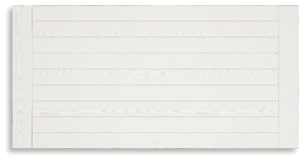 Details D642D7: Includes dining table top and base, Made with rubberwood solids, ash veneer and MDF substrates, Antiqued white finish with wood grain texture, Two 10-bottle wine storage shelves (1 reversible), Lower door cabinet accessible from both sides, 2 pass-through drawer bins, Assembly required, D642-124: Made with wood, Antiqued white finish with wood grain texture, Foam cushion with polyester upholstery, Nailhead trim, X-back, Assembly required,