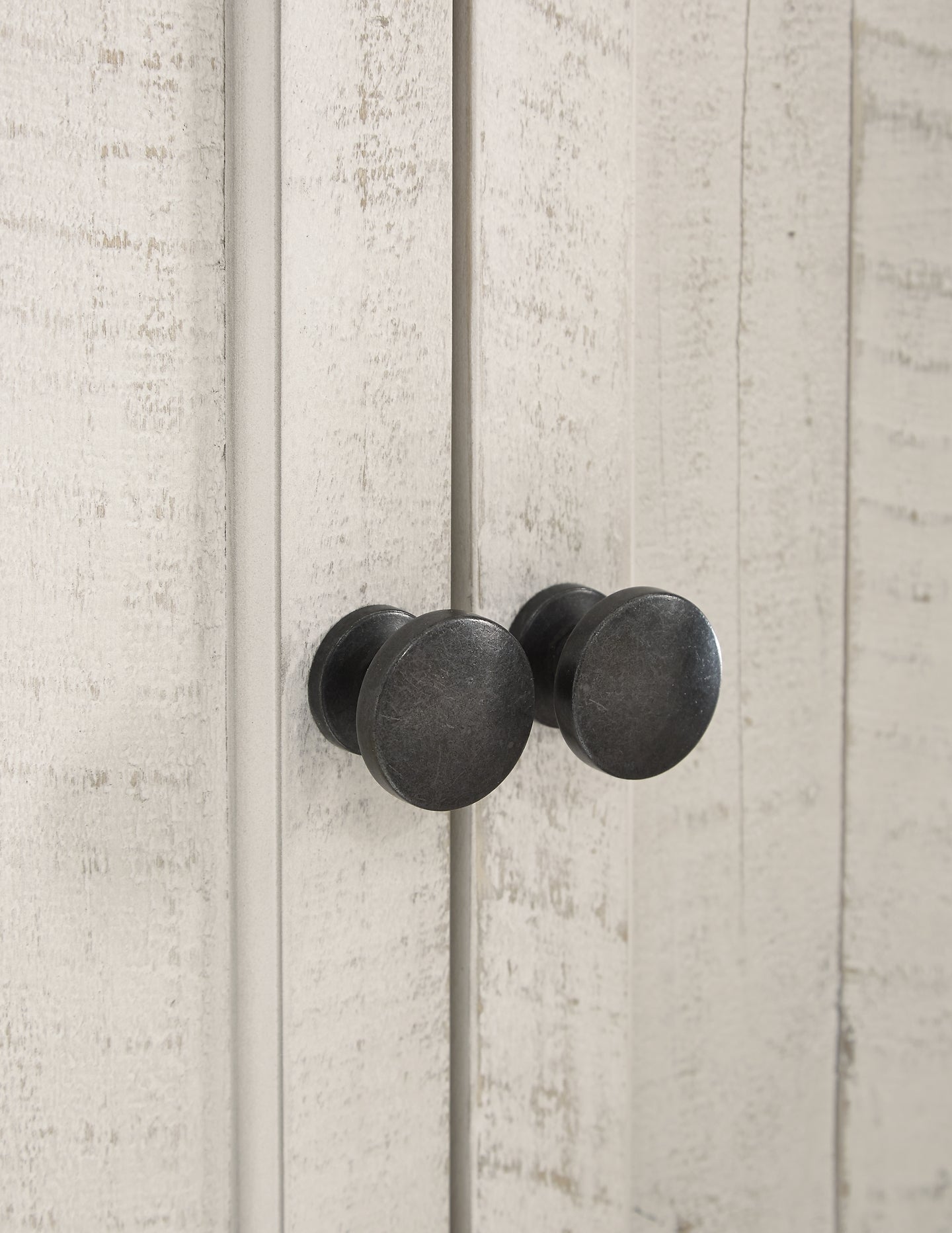 Details | Made of pine wood, pine veneers and engineered wood, Two-tone distressed finish: weathered gray top; vintage white base, TV stand with 2-door cabinet with single-shelf storage and 2 open shelves, Aged iron-color hardware, Cutouts for wire management, Assembly required | |