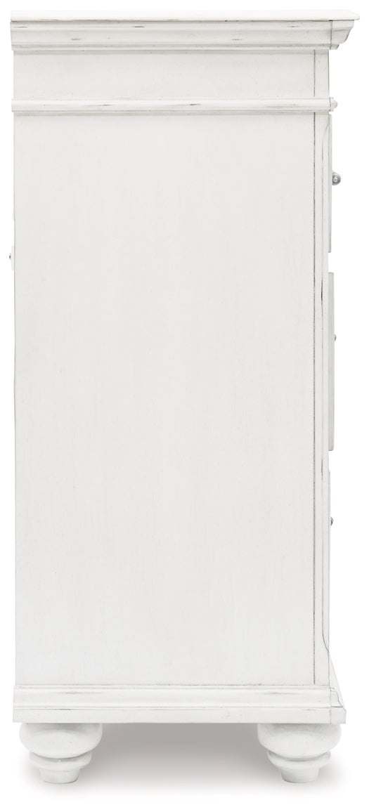 Give your retreat vintage charm and valuable drawer storage with this dresser. In a beautifully distressed whitewash finish, you'll love putting it all away in casual style. Seven full-sized drawers and two accessory top drawers will easily accommodate your needs. Generously scaled moulding from top to bottom, along with bun feet and drawer handles with a transitional aesthetic, give this dresser character—evoking the feel of a quaint cottage escape.