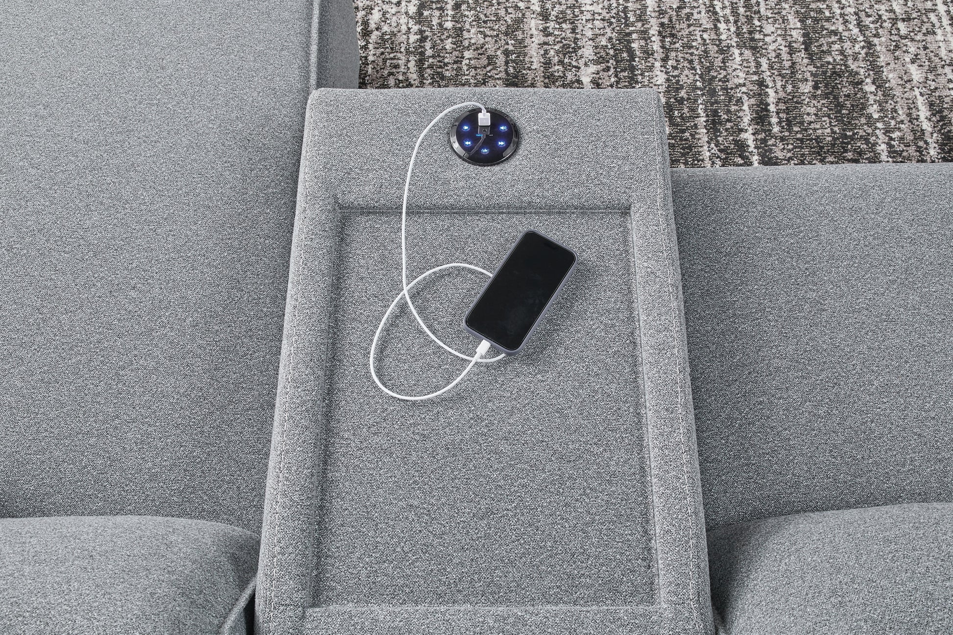 Details | Includes 6 modular pieces: left-arm facing power reclining back chaise, power armless recliner, armless chair, console with audio system, wedge and right-arm facing power recliner, "Left-arm" and "right-arm" describe the position of the arm when you face the piece, Versatile modular pieces fit together in a variety of configurations, One-touch power control with adjustable positions, Easy View™ adjustable headrest and zero-draw USB port, Zero-draw technology only consumes power when the USB receptacle is in use, Corner-blocked frame with metal reinforced seat, Attached seat and back cushions; high-quality foam cushions wrapped in poly fiber, Polyester upholstery; Next-Gen Nuvella™ is a family-friendly fabric that is soft, easy to clean, stain-resistant and durable, Clean fabric with mild soap and water, let air dry; for stubborn stains, use a solution of 4 oz. bleach to 28 oz. water, Throw pillows with easy-to-remove zippered covers for machine washing; pillows with soft polyfill, Console with plexiglass top; built-in audio sound system with wireless connectivity; audio controls located on console; USB charging, Zero wall recliner design requires minimal space between wall and chair back, Power cord included; UL Listed | |