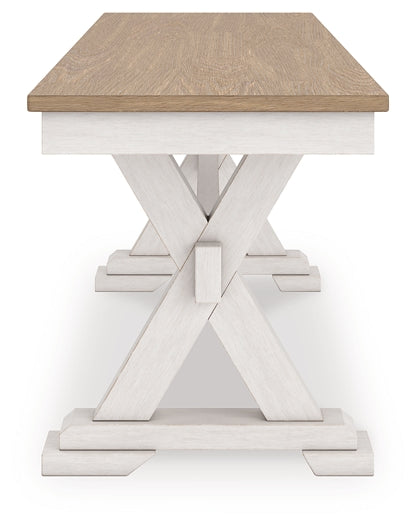 Busy breakfasts and family dinners get a dose of modern farmhouse flair with this dining bench. Its two-tone finish contrasts a light butcher block hue with antiqued white for an utterly charming effect. An effortless seating solution, the bench can tuck under your table to give you extra space to maneuver through the dining room.